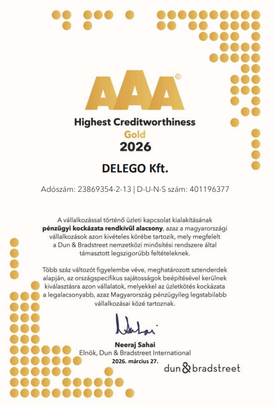 Büszkék vagyunk arra, hogy Magyarország pénzügyileg egyik legstabilabb vállalataként, AAA (üzleti kapcsolat kialakításának pénzügyi kockázata rendkívül alacsony) tanúsítványt kapunk évről évre a Dun & Bradstreet nemzetközi minősítési rendszere által.